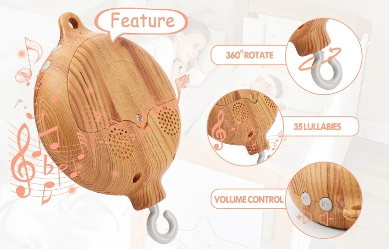 【0-100 Adjustable volume】: Baby crib mobile music box adopts stepless volume, you can adjust the volume at will to improve the listening experience and the volume adjustment ensures that the audio is played at the proper volume.