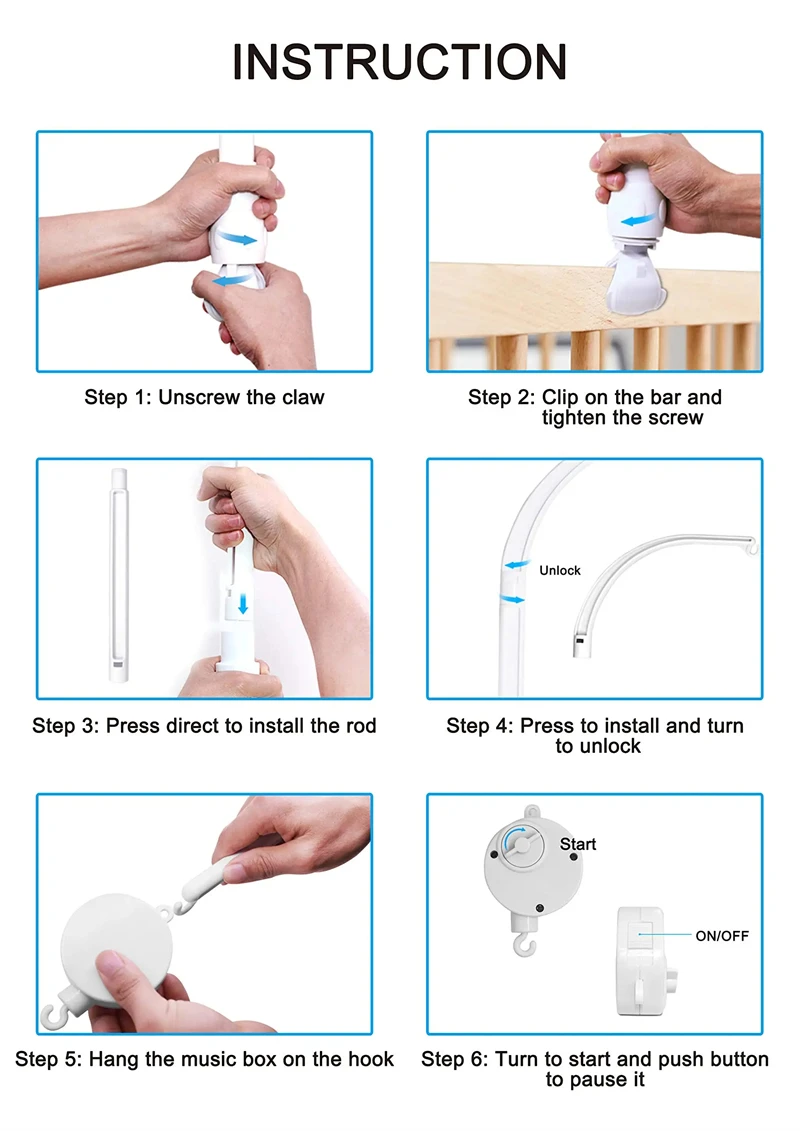 【3 Modes】: After the new upgrade, Baby crib mobile musix box has three play methods, rotating&music, music only, rotating only.