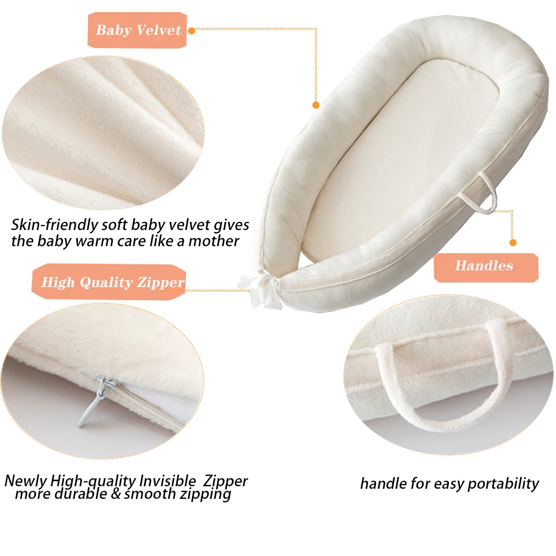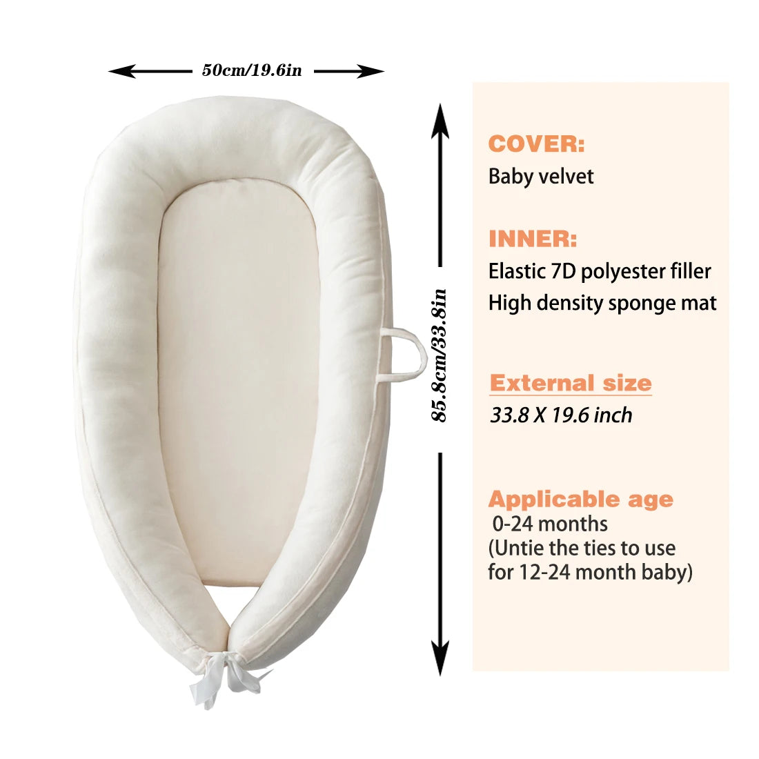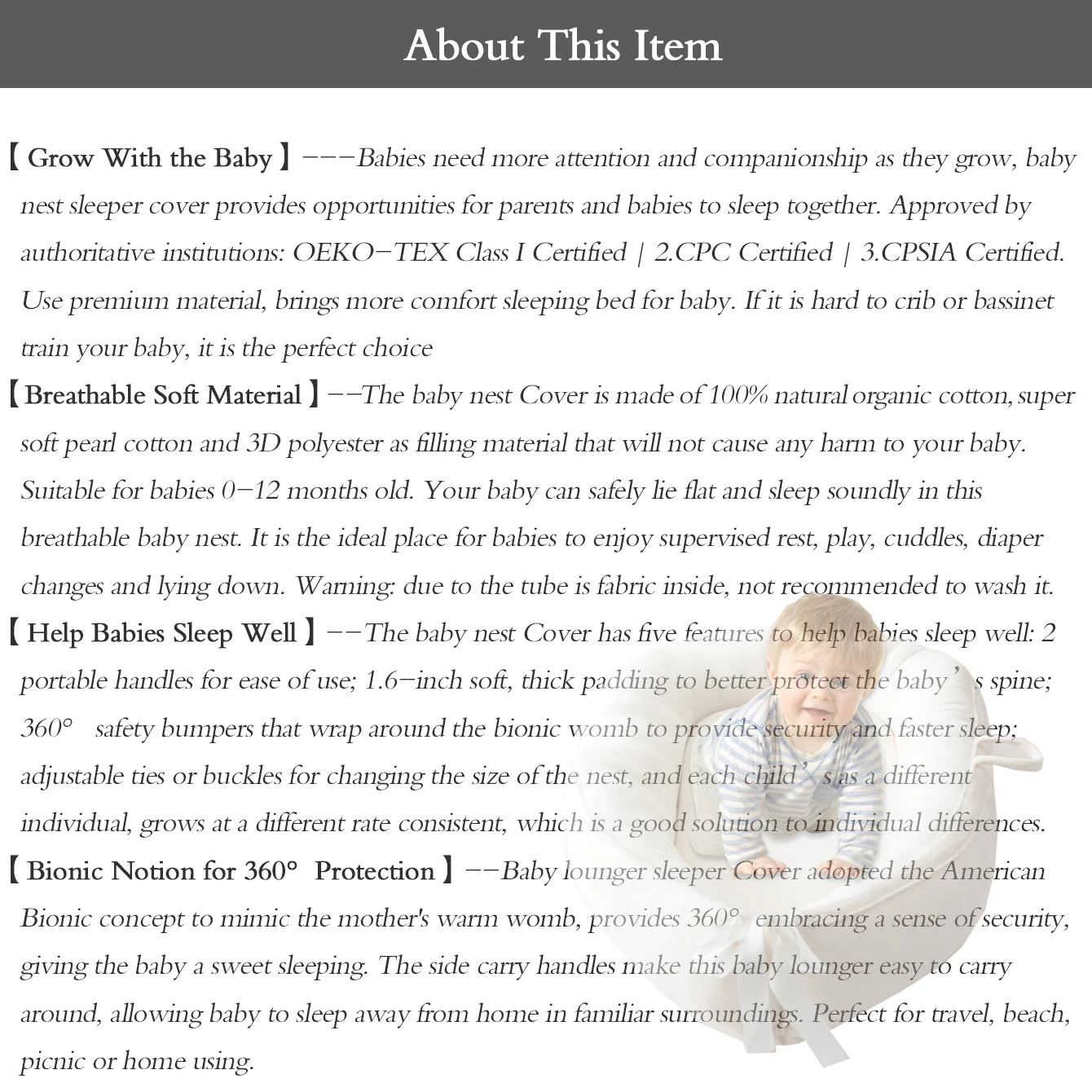 Breathable Soft Material 】--The baby nest Cover is made of100% natural organic cotton, supersoft pear cotton and 3D polyester as filling material that will not cause any harm to your baby.Suitable for babies 0-12 months old. Your baby can safely lie fat and sleep soundly in thisbreathable baby nest. It is the ideal place for babies to enjoy supervised rest, play, cuddles, diaperchanges and lying down. Waming: due to the tube is fabric inside, not recommended to wash it.Help Babies Sleep Well 】 --The baby nest Cover has five features to help babies sleep wel: 2portable handles for ease ofuse,; 1.6-inch soft, thick padding to better protect the baby’s spine,360° safety bumpers that wrap around the bionic womb to provide security and faster sleep;adjustable ties or buckles for changing the size ofthe nest, and each childs as a diferentindividual, grows at a diferent rate consistent, which is a good solution to individual diferences.Bionic Notion for 360° Protection 】--Baby lounger sleeper Cover adopted the AmericanBionic concept to mimic the mother's warm womb, provides 360° embracing a sense ofsecurity.giving the baby a sweet sleeping, The side carry handles make this baby lounger easy to carryaround, allowing baby to sleep away fiom home in familiar surroundings. Perfect for travel, beachpicnic or home using.